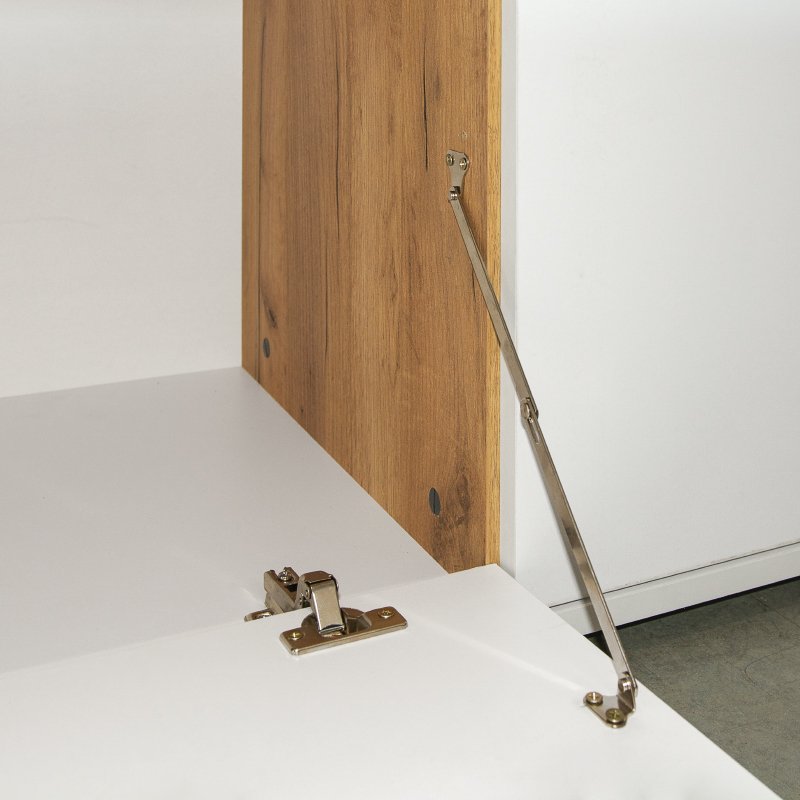Распашные двери установлены на четырехшарнирные петли, выдвижные ящики — фолдинги на шариковых направляющих.