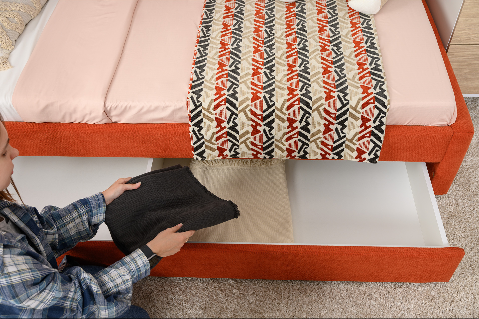 Ящик кровати — выкатной (на колесиках) — внутри разделен перегородкой.