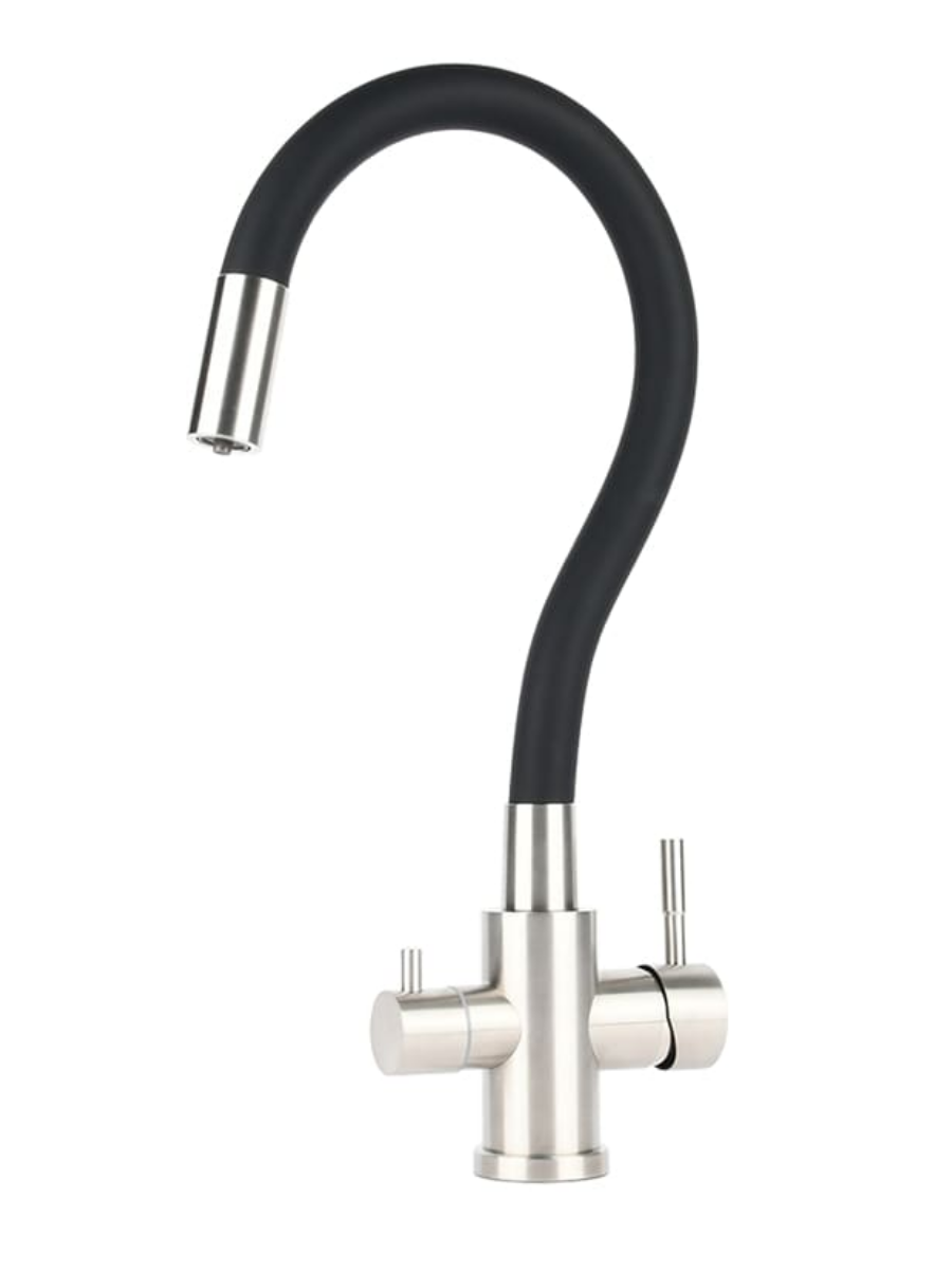 Смеситель для кухни из нержавеющей стали с гибким изливом в силиконовой оплетке, с выделнным каналом для питьевой воды.