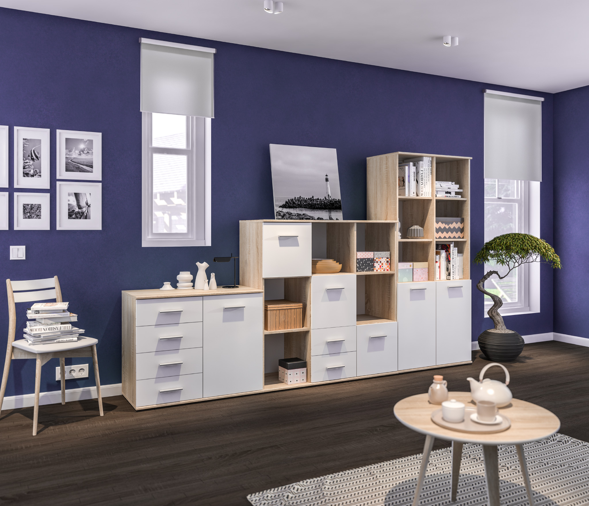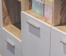Габаритные размеры – ширина 78 см, высота 176 см и глубина 44 см. Конструктивно стеллаж состоит из нескольких вместительных открытых полок и из отделения с непрозрачными дверцами.Модель производится из современного материала КДСП. Отделка комбинированная – корпус в цвете «Дуб Сонома», фасадные поверхности белые.