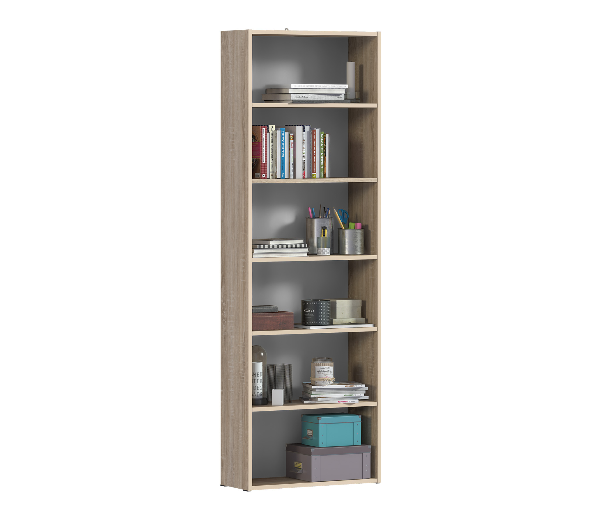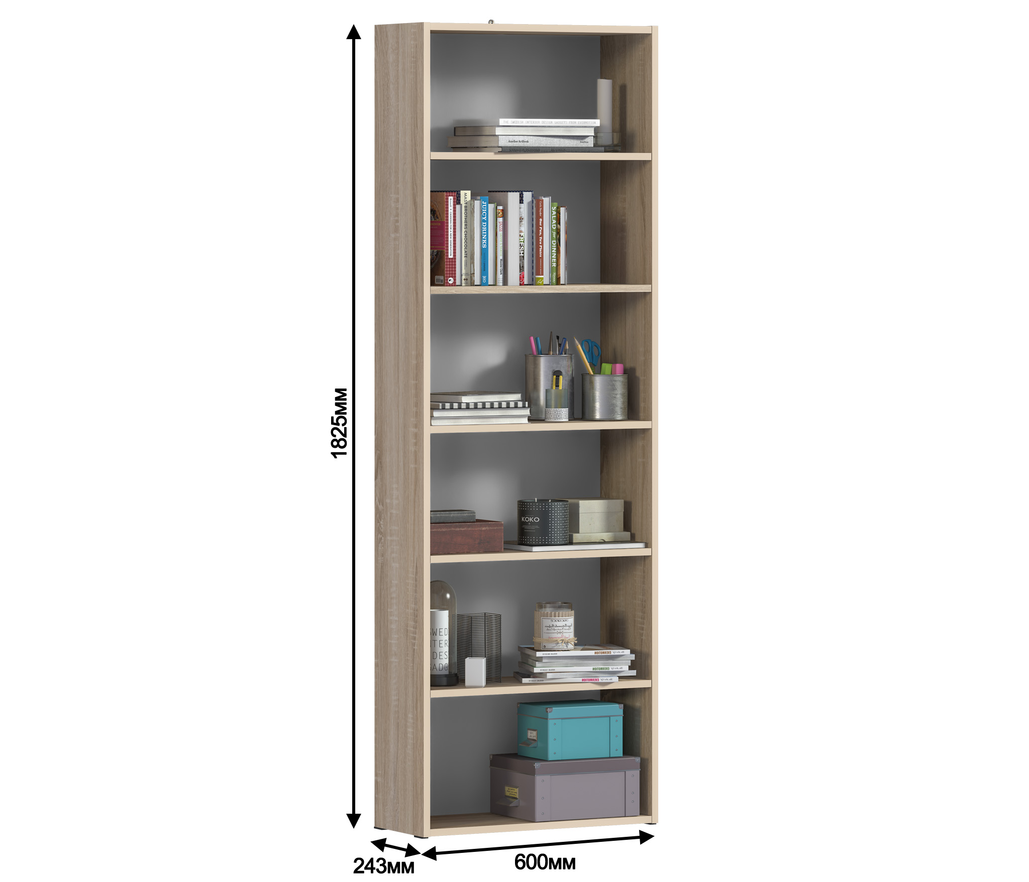 Габаритные размеры – ширина 60 см, высота 182 см и глубина 24 см. На шести открытых просторных полках можно без труда разместить книги, журналы, сувениры и множество памятных предметов.Выполнен стеллаж из прочного и современного КДСП, в приятном оттенке "Дуб Сонома". Для обеспечения максимальной устойчивости стеллаж надежно крепится к стене. Все необходимые крепёжные элементы входят в комплект.