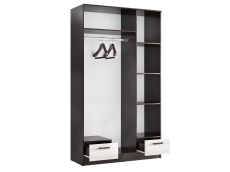 Распашной шкаф Адель разделен на две функциональные зоны: с одной стороны предусмотрена штанга для плечиков, а с другой — ряд полок для хранения вещей. Выдвижные ящики позволят аккуратно разместить белье и аксессуары. Фасады украшают два зеркала в полный рост.