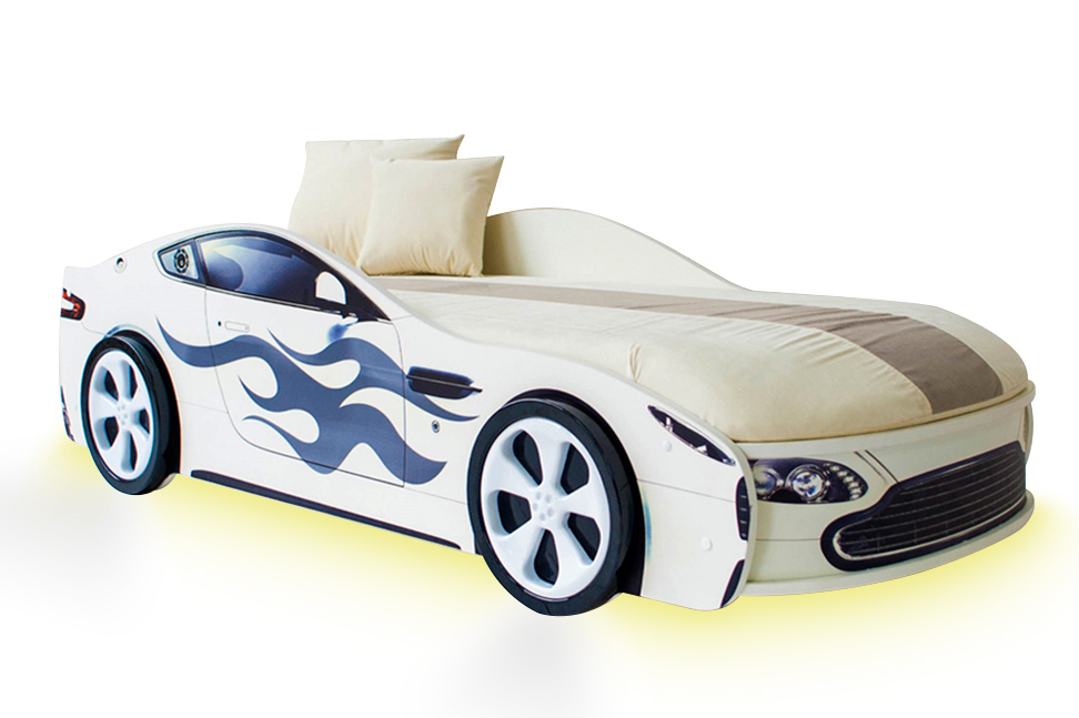 Светодиодная подсветка используется в качестве ночника. Приглушенный, рассеянный, желтоватый свет радует глаз, успокаивает и абсолютно не мешает засыпать ребенку. Является безопасной в использовании, напряжение всего 12В, поэтому отсутствует риск возгорания и нагревания.Светодиодная лента 1,5 м располагается под днищем кровати.