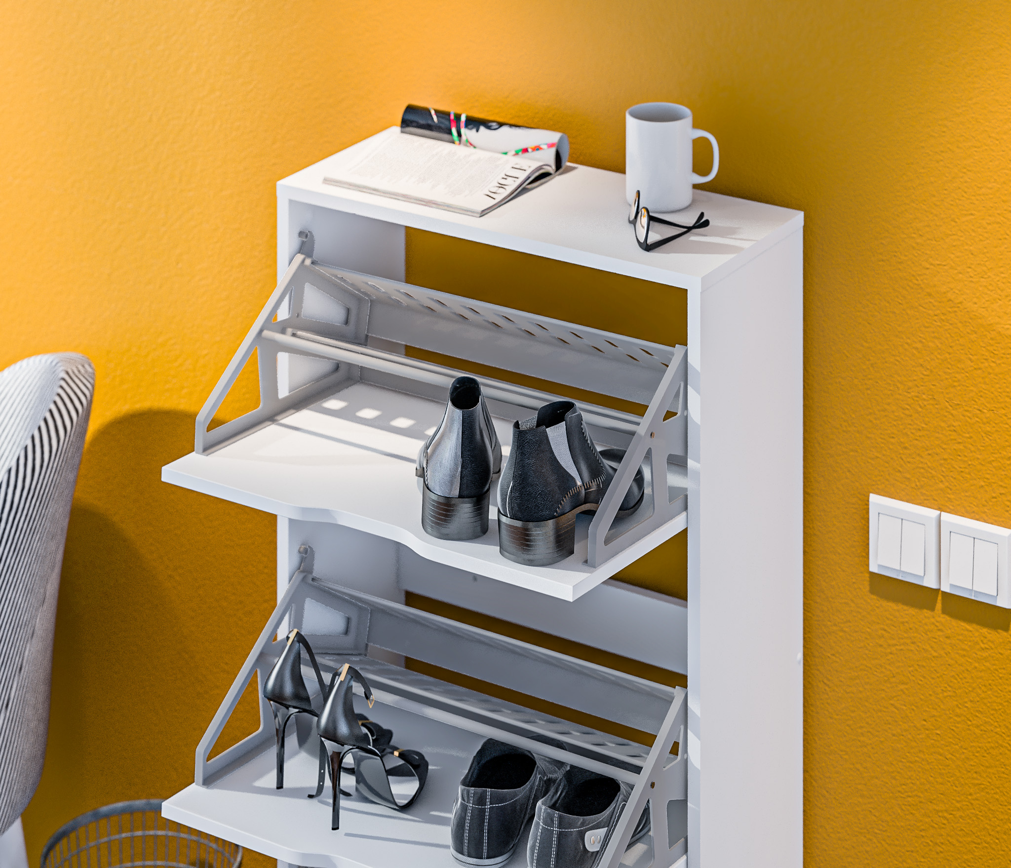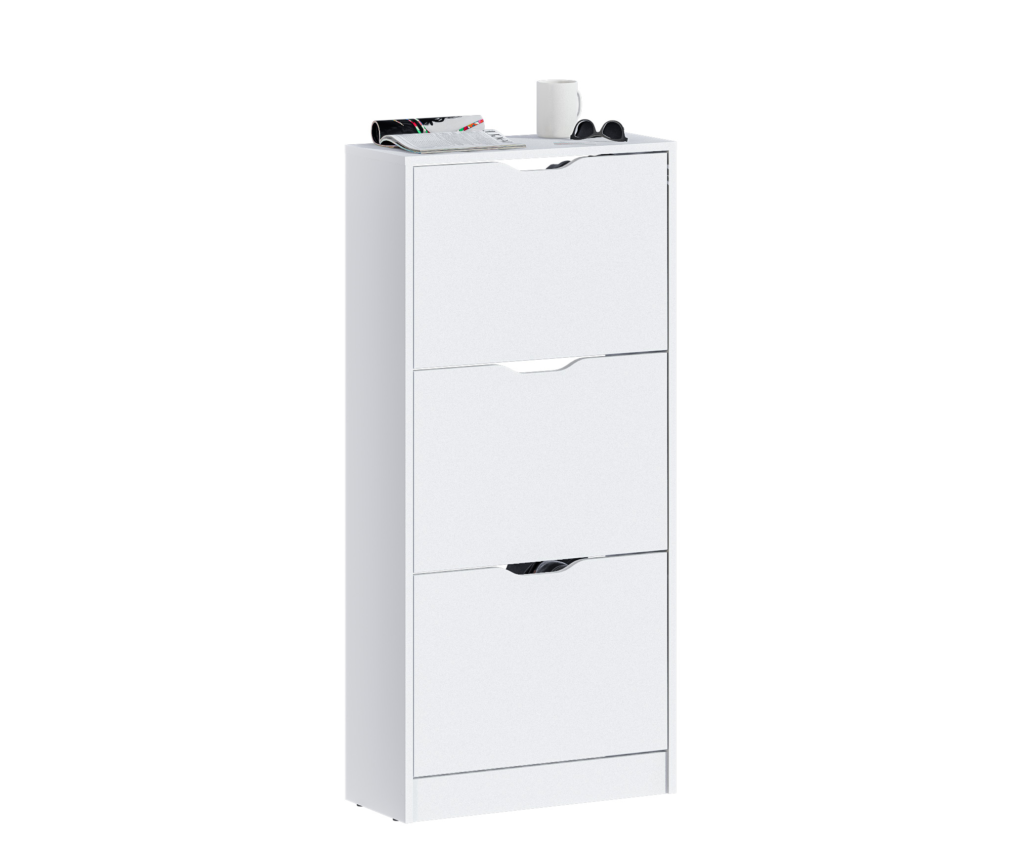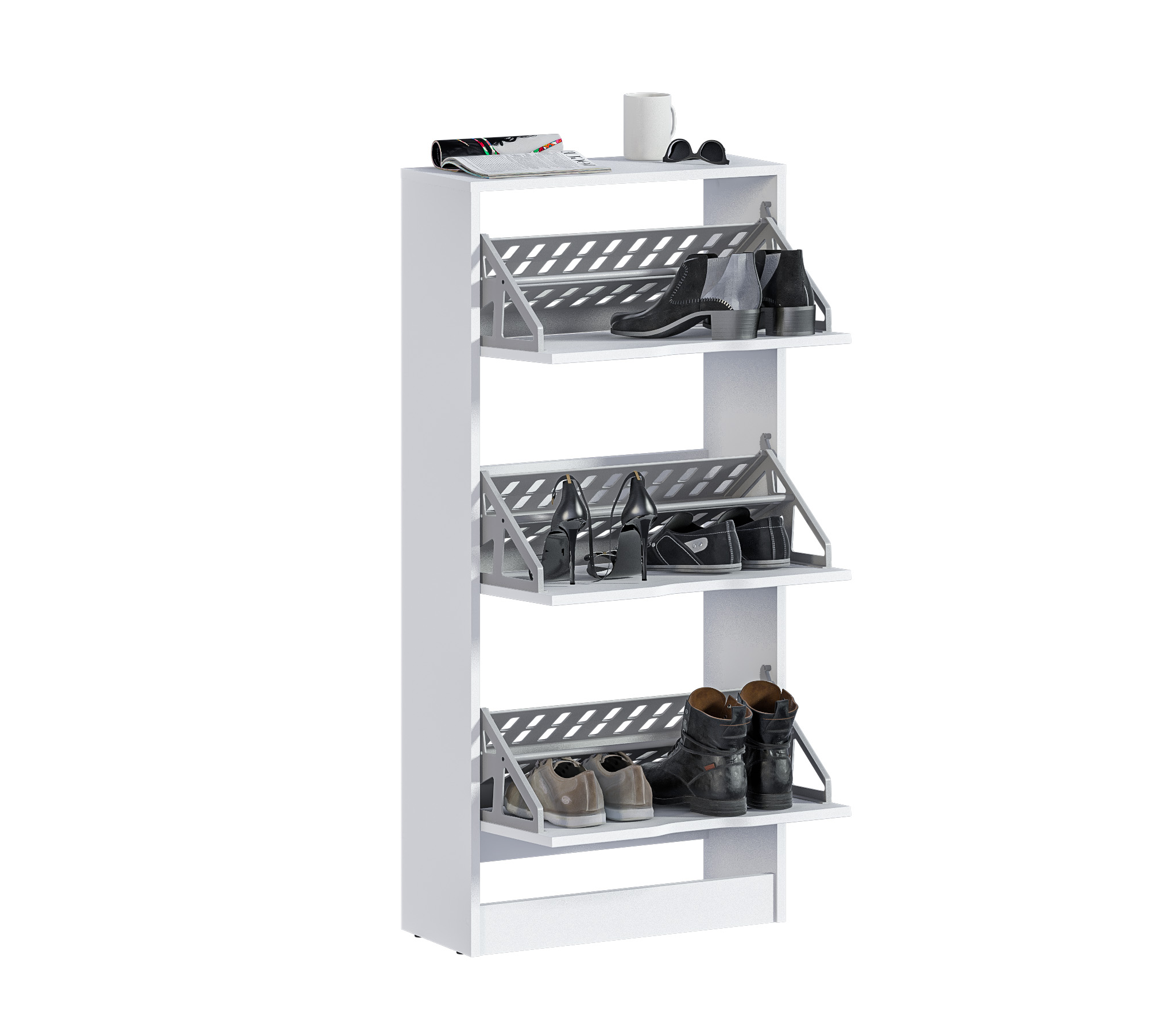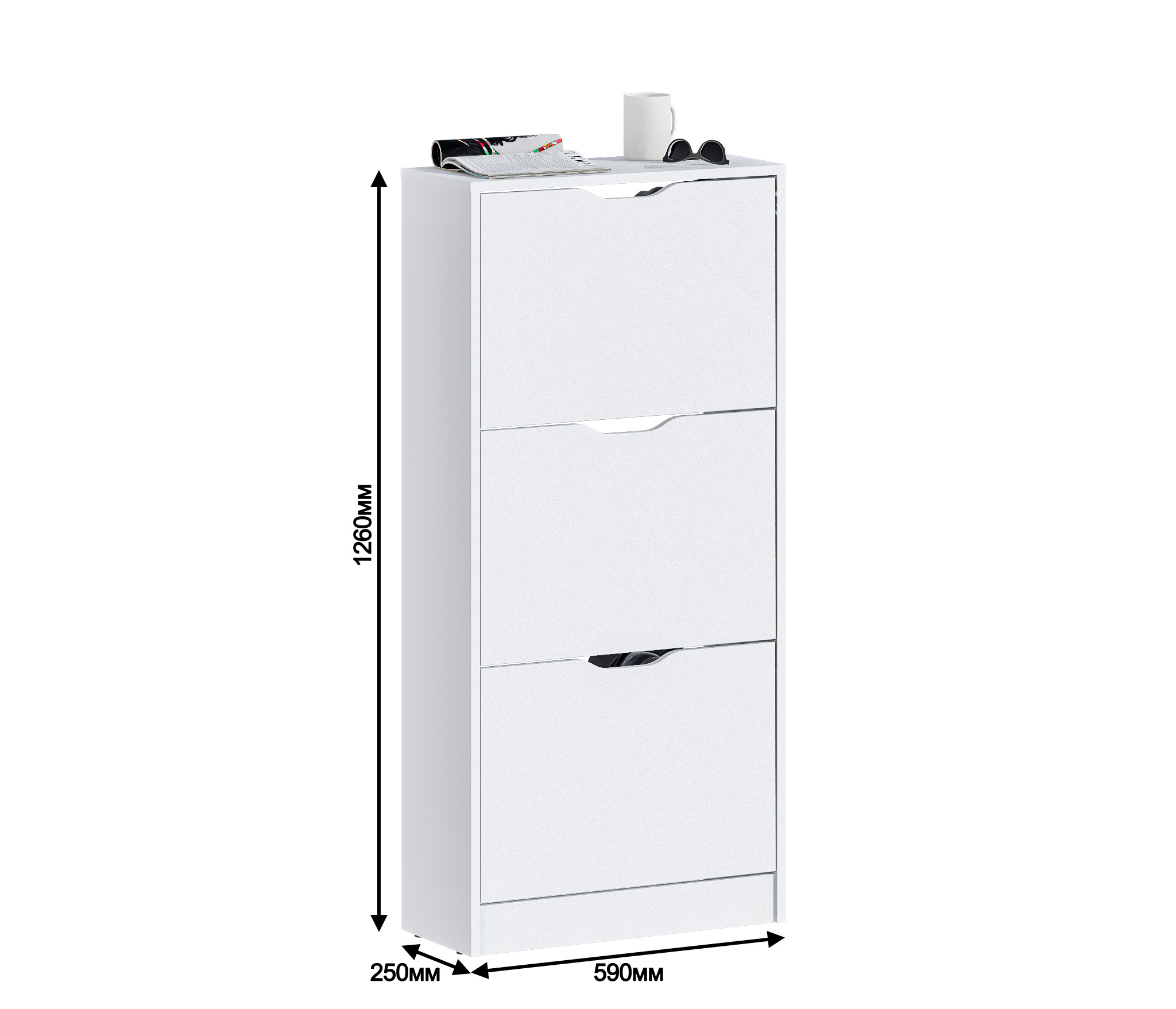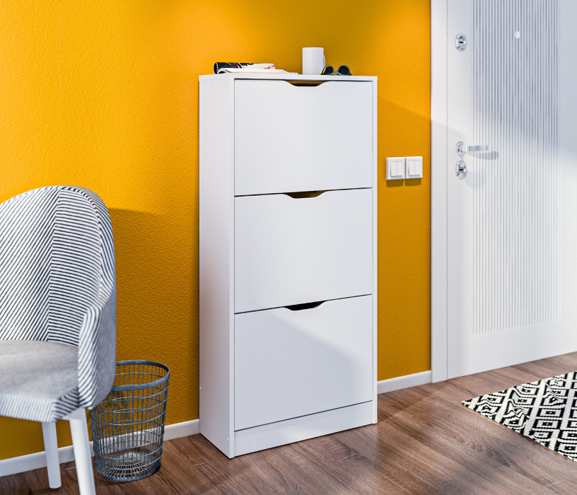 Габаритные размеры – ширина 59 см, высота 126 см и глубина 25 см. Обувница имеет три отделения, каждое из которых оснащено специальными стойками для хранения обуви. Прорезные ручки и строгие геометрические формы позволяют вписать обувницу в любой интерьер. Обувница произведена из экологичного прочного КДСП, устойчивого к мелким механическим повреждениям.