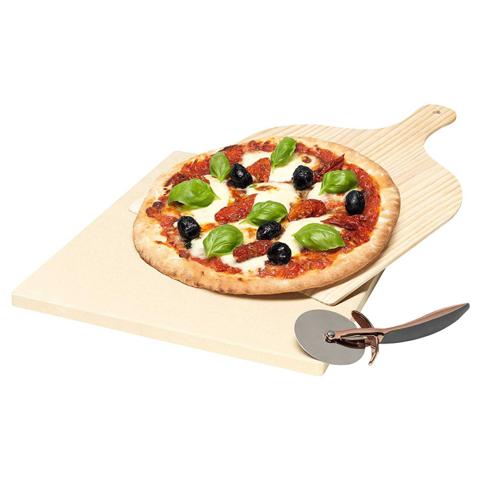 Камень для выпечки и пиццы: деревянная лопатка, роликовый нож из нержавеющей стали и брошюра в комплекте. Материал: огнеупорная глина, размер: 300 х 380 х 15 мм.
