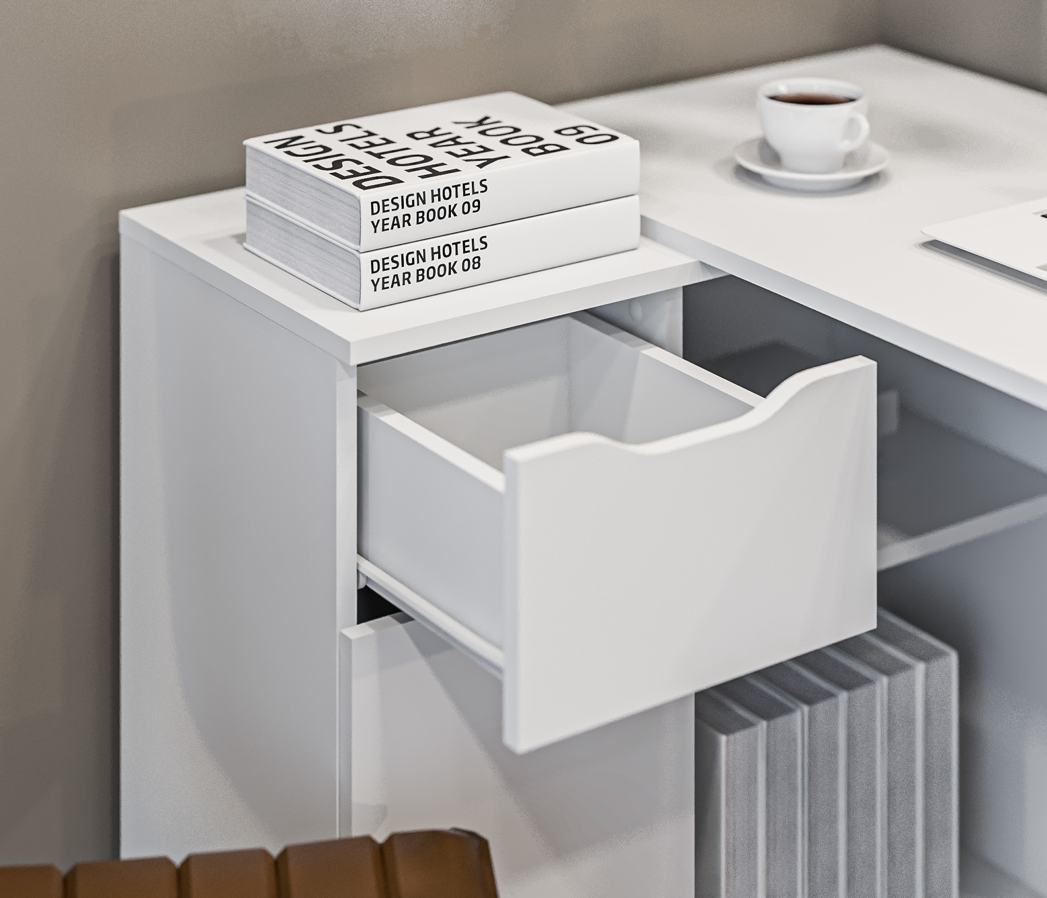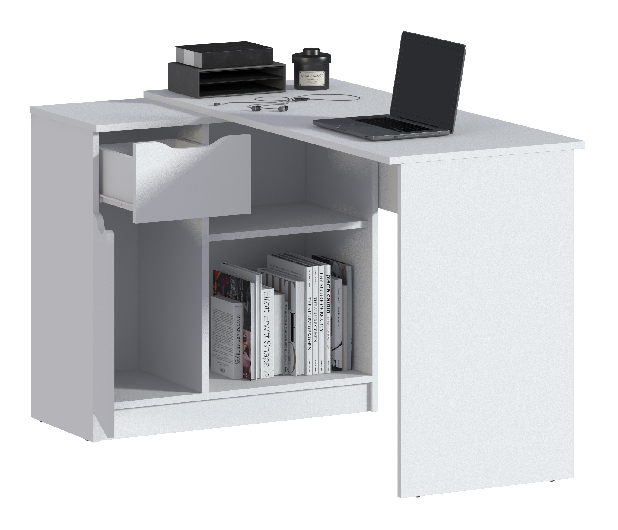 Стол оснащен одним ящиком и дверцей, которые предлагают удобное место для хранения канцелярских принадлежностей, документов и других необходимых предметов. Кроме того, имеется одна большая полка, которая предоставляет дополнительное пространство для размещения книг, файлов или других материалов.