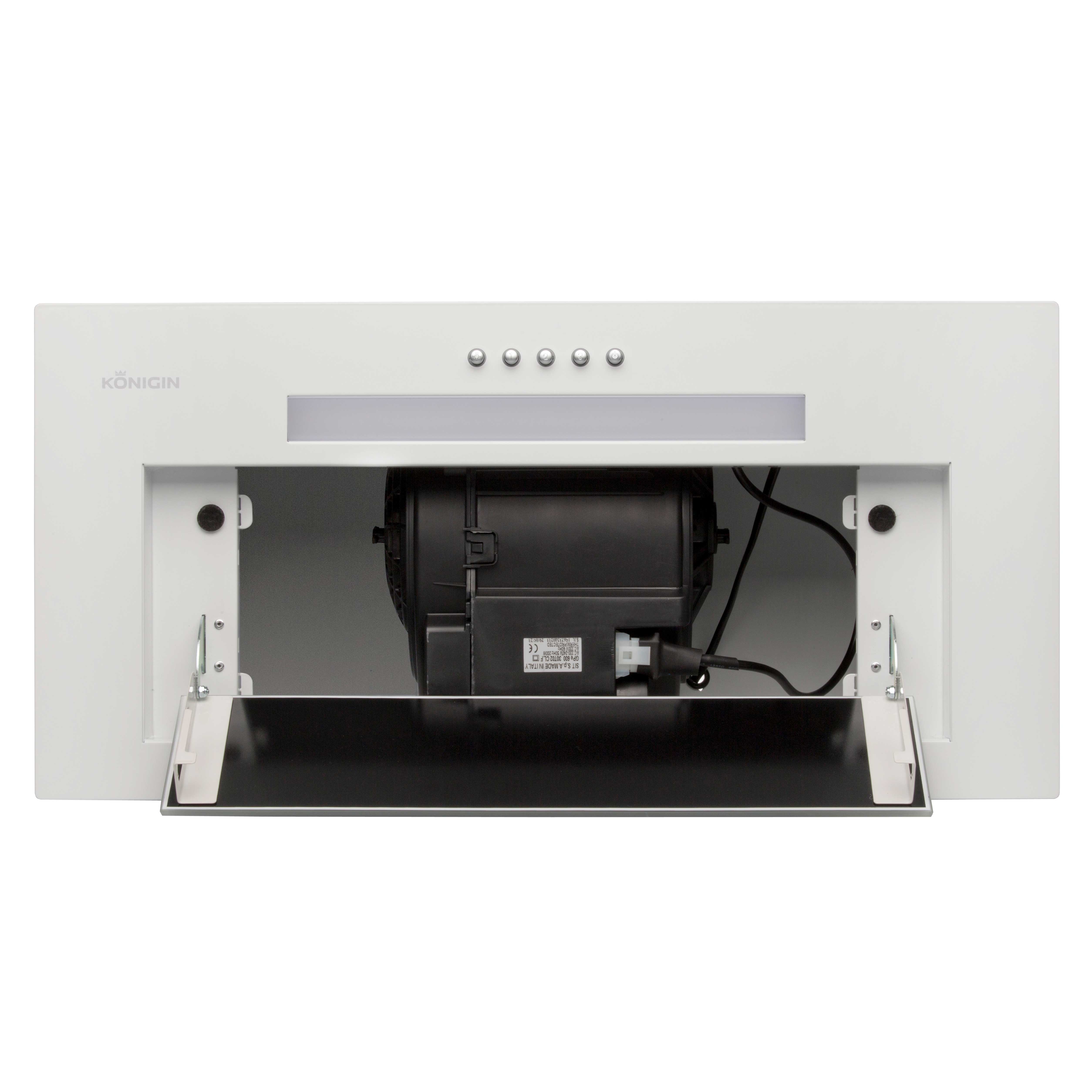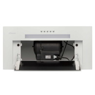 • Полностью встраиваемая вытяжка.Стильное сочетание закаленного стекла и окрашенной стали. Декоративный люк из закаленного стекла скрывает пятислойный алюминиевый, жироулавливающий фильтр с усиленной конструкцией