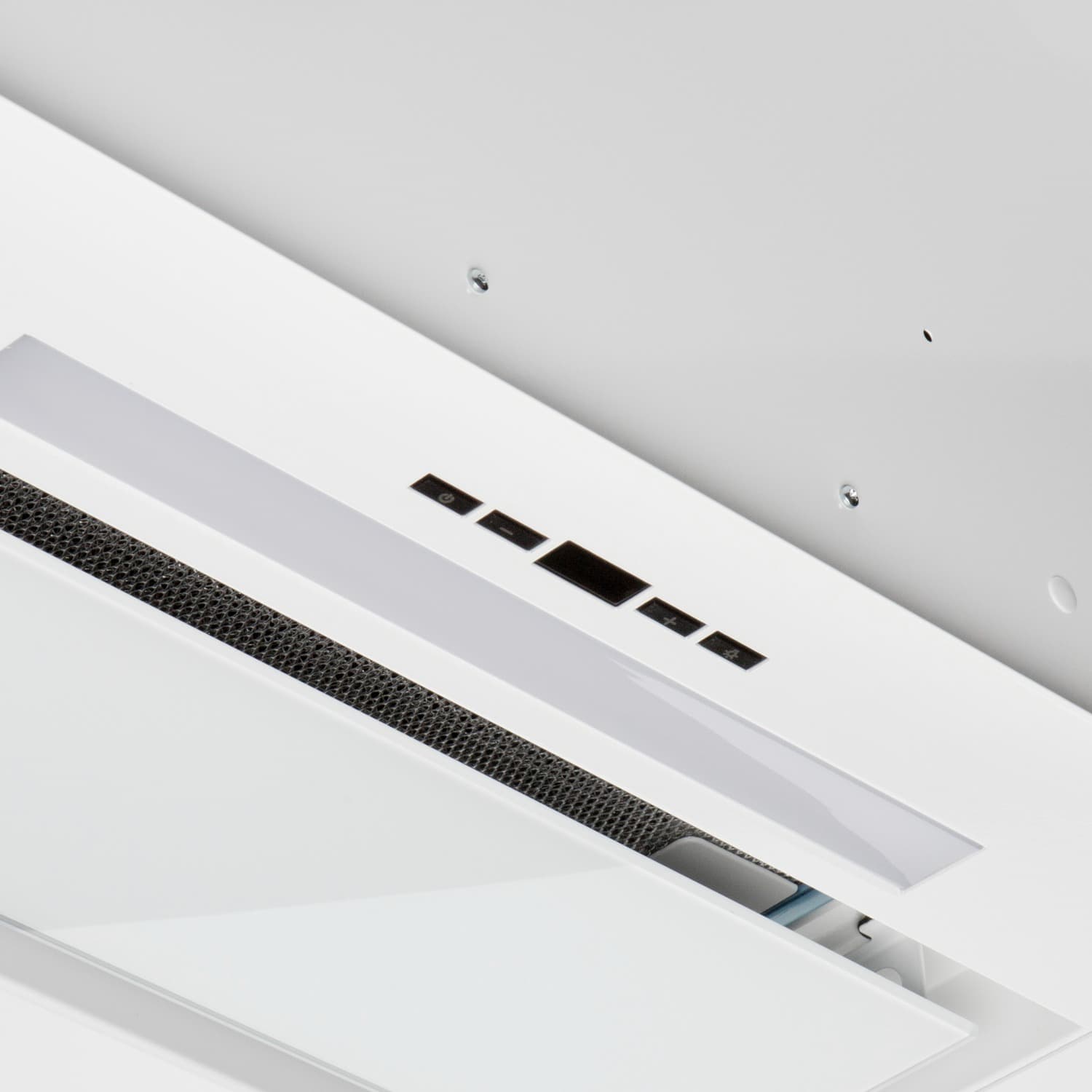 • Фасад вытяжки полностью закрывает нижнюю полку – это позволяет монтировать вытяжку в кухонные шкафчики вместо нижней полки (дна). Удобная система монтажа.