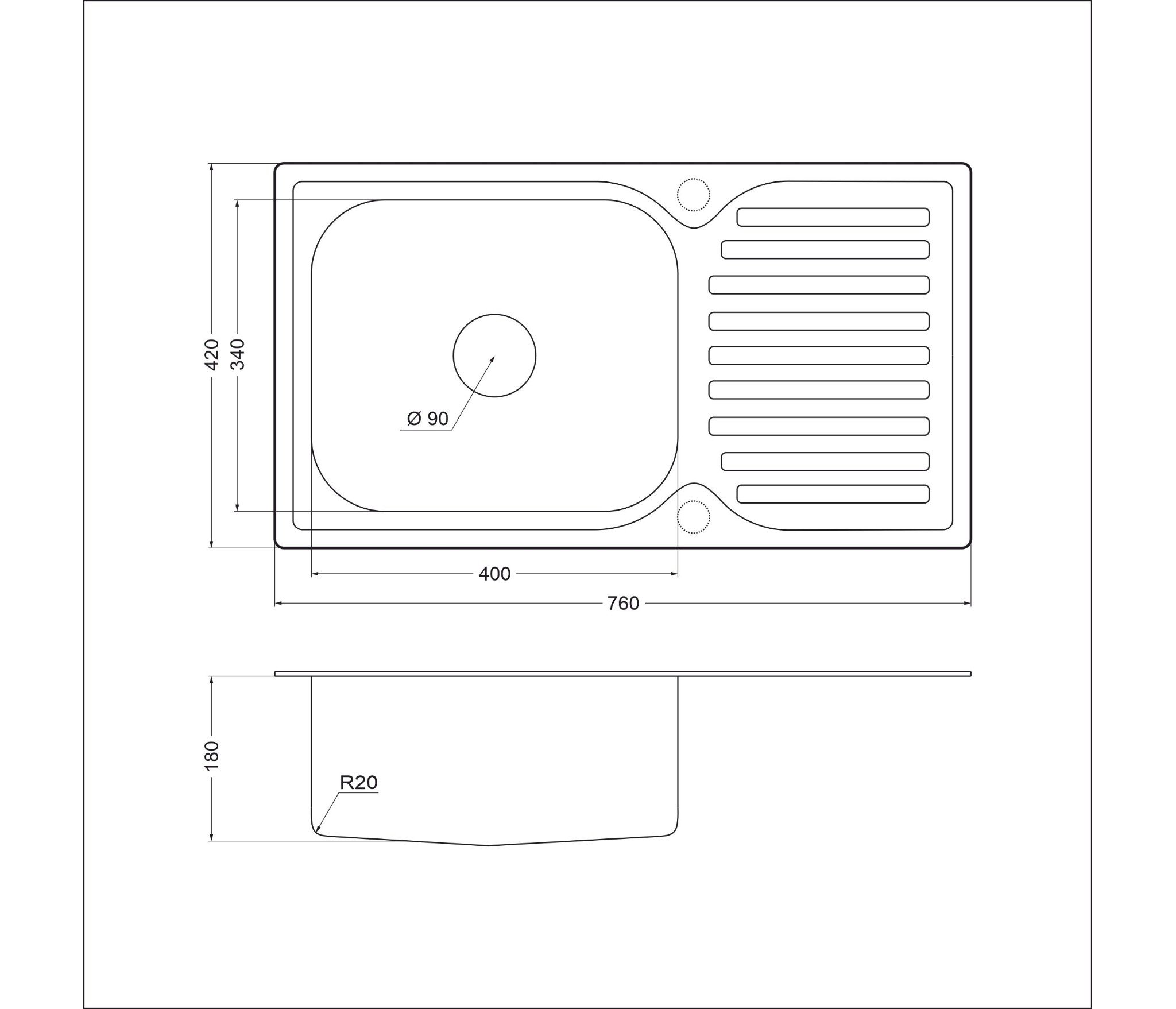 Вырез под мойку, 740 x 400 мм Размеры чаши, 400 x 340 мм Габаритные размеры мойки: 760 x 420 мм Размеры чаши: диаметр и глубина ( ) 400 x 340 мм и глубина 180 мм.